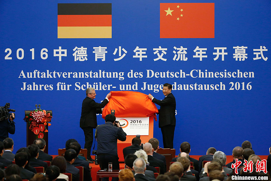 3月21日,中国国家主席习近平与德国总统高克共同出席2016中德青少年交流年开幕式(图片来自中新网)